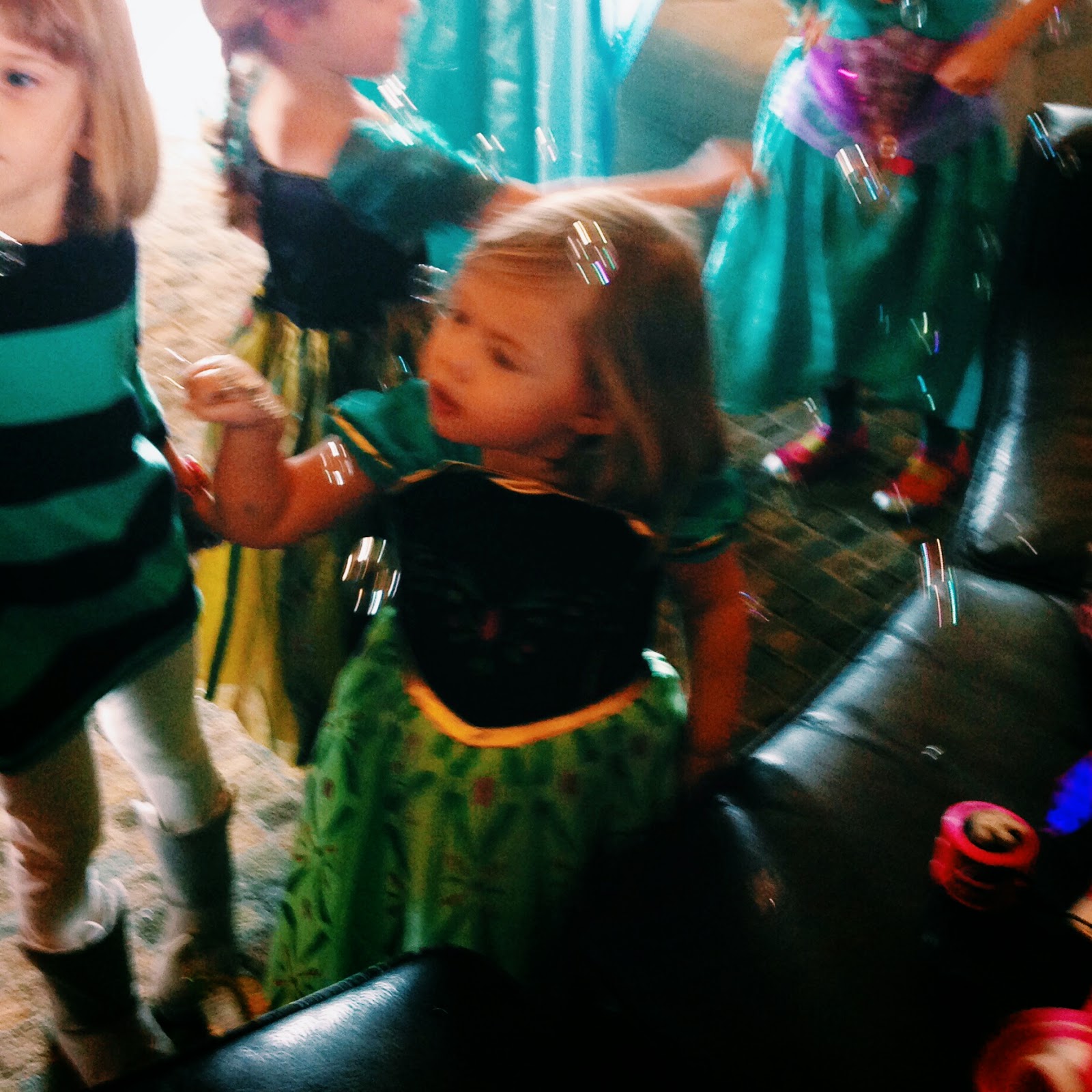 The party was decorated to perfection with snowflakes and tons of glitter. Complete with "Melted Snow" water bottles, Frozen punch, and sparkly tinsel. Each little girl of course had a bow or crown prominently on their heads. Bubbles were blown, cake was eaten, and Elsa was loved on.